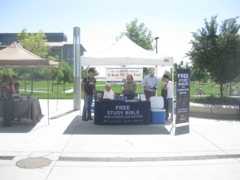 今天,二〇一一年九月一日,是加州大学默塞德分校的社区展览日。我们有圣经为美国(BFA)的桌子。我们一共送出去55本英文和8本西语的新约恢复本圣经。一个女孩当场呼求主名得救,并将与一位姊妹开始每周读经。许多收到圣经的人都感谢我们的到来。请为我们能跟进这些新人而祷告。