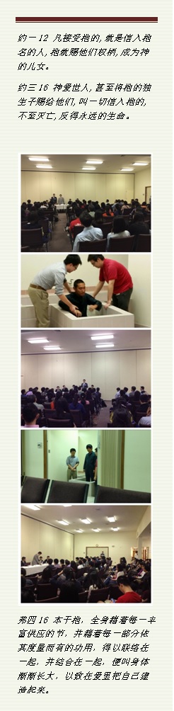 借着这样的福音行动,整个身体都动了起来。周六聚会开始前,所有服侍的弟兄们又聚在一起简短迫切的祷告。年轻的圣徒们在前面争战,年长的圣徒们也在一同守望祷告。年长的圣徒们更是在饭食准备上为我们节省时间,甚至连饭菜都提前打好一份一份地摆在桌子上,吃饭地座位也是把圣徒和福音朋友们渐次排开。第一堂真理座谈结束后,就有两位福音朋友受浸。第二堂的福音聚会,借着David 弟兄的信息 - “基督是我们的生命”,诗歌 -“你为何被造”,“听我唱奇妙爱”,“基督使我心中喜乐”和弟兄姊妹们甜美的见证,又有一位福音朋友归入主名。